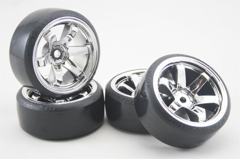 Универсальные колеса для дрифта с хромированными дисками и твердой резиной, комплект (4 шт) на всю машину. Основное использование в масштабе 1/10.