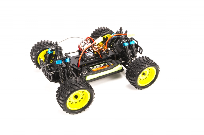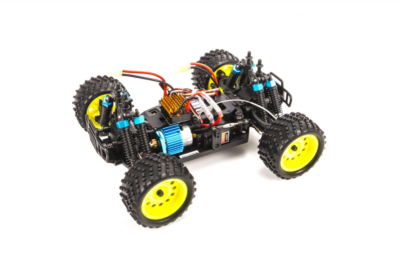 Полный комплект включает: Собранное шасси , Установленный электродвигатель rc380, Покрашенный кузов, Комплект 2x-канальной аппаратуры 2.4G с одной сервомашинкой, аккумулятор 1100мА, зарядное устройство.