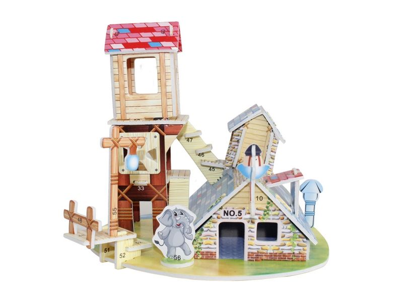 Из деталей 3Д пазла "Домик животных" можно собрать домик животных с переходом в разные части дома. Подняться наверх можно, взбираясь по крутой лестнице. В набор также входит фигурка слона. Порядок сборки определяется маркировкой на деталях.