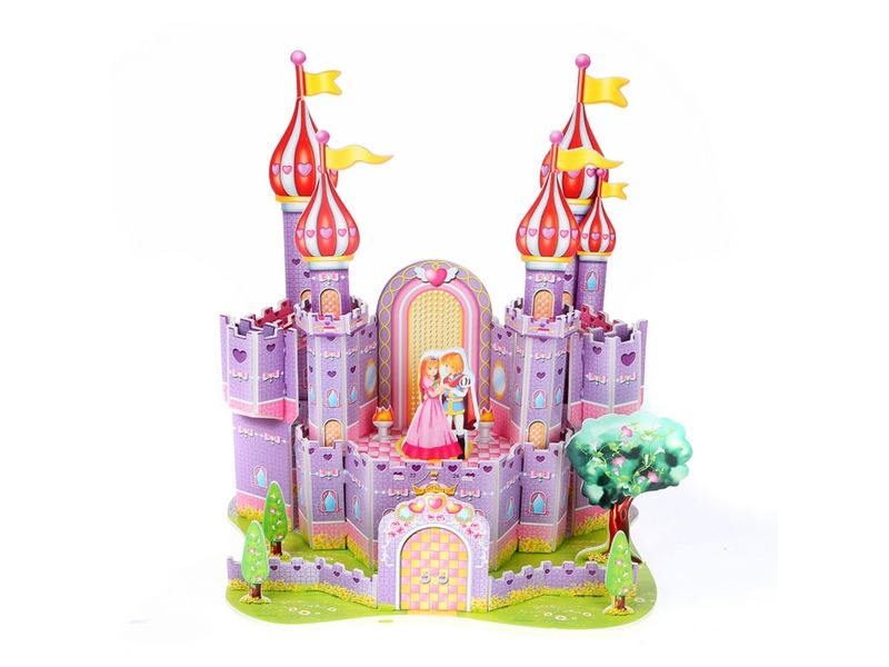 Из деталей 3Д пазла "Фиолетовый замок" можно собрать романтичный фиолетовый замок с принцем и принцессой. Башни замка украшают флаги.
