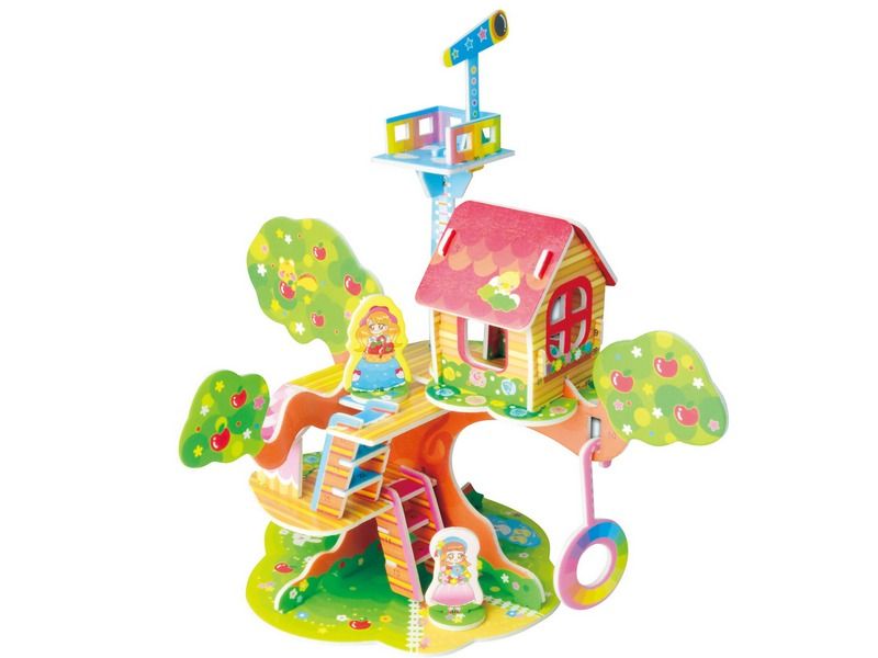 Из деталей 3Д пазла "Лесной домик 4" можно собрать домик на дереве. Он расположен высоко на раскидистых ветвях яблони. Добраться к нему можно только, воспользовавшись высокой лестницей. Чуть выше домика установлена подзорная труба, с помощью которой днем можно разглядывать окрестности, а ночью любоваться звездным небом.