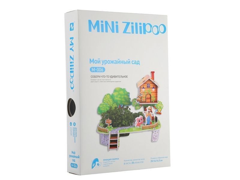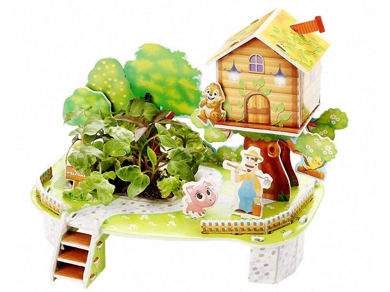 Из деталей 3Д пазла "Мой урожайный сад" можно собрать дом-чердак, вход в который украшают два красивых фонаря. Рядом с домом расположен небольшой сад и грядки с зеленью. В доме кроме садовника живут свинка, бурундук. Также можно вырастить своими руками клумбу. В наборе для этого есть грунт и семена.