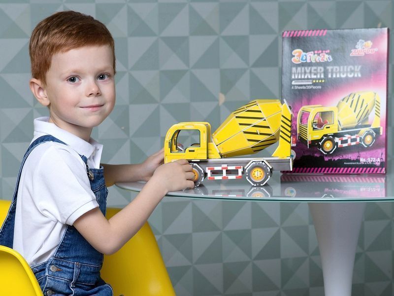 Из деталей 3Д пазла "Бетоносмеситель" можно собрать модель бетономесителя, оборудования необходимого на каждой строительной площадке. Кабина водителя, колеса, сама бетономешалка - части автомобиля хорошо детализированы.