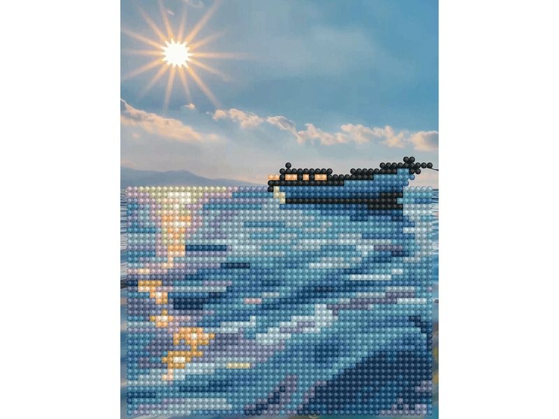 В наборе Лодка на рассвете из мозаичных элементов можно выложить морской пейзаж, горы вдали, блики солнца на поверхности воды. При этом выкладывать нужно не полностью весь холст, как в случае с полной выкладкой, а только его часть.