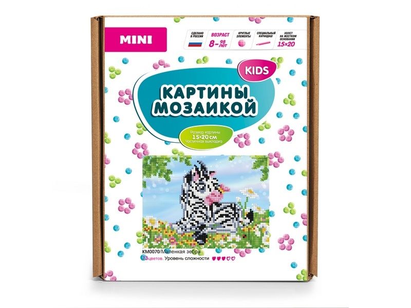 В наборе Маленькая зебра из мозаичных элементов можно выложить зебру на ярком, цветущем лугу. Голубое небо нанесено на холст.
