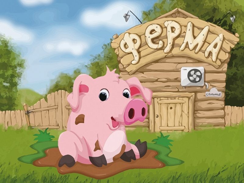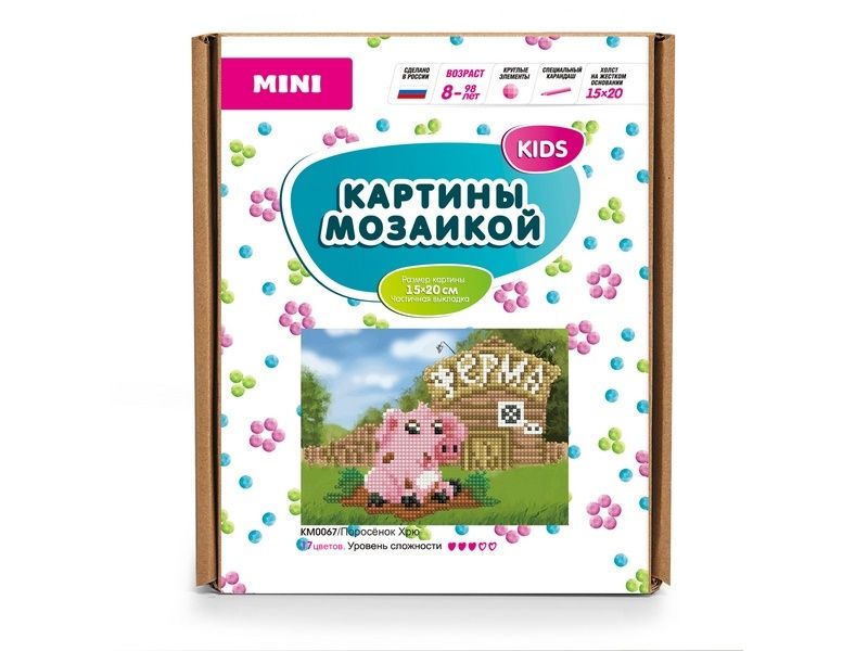 В наборе Поросенок Хрю из мозаичных элементов можно выложить милого поросенка, сидящего в луже. Здание фермы тоже выполняется из мозаики. Остальная часть картины - голубое небо, зеленый луг, деревья на заднем фоне уже нанесены на холст.