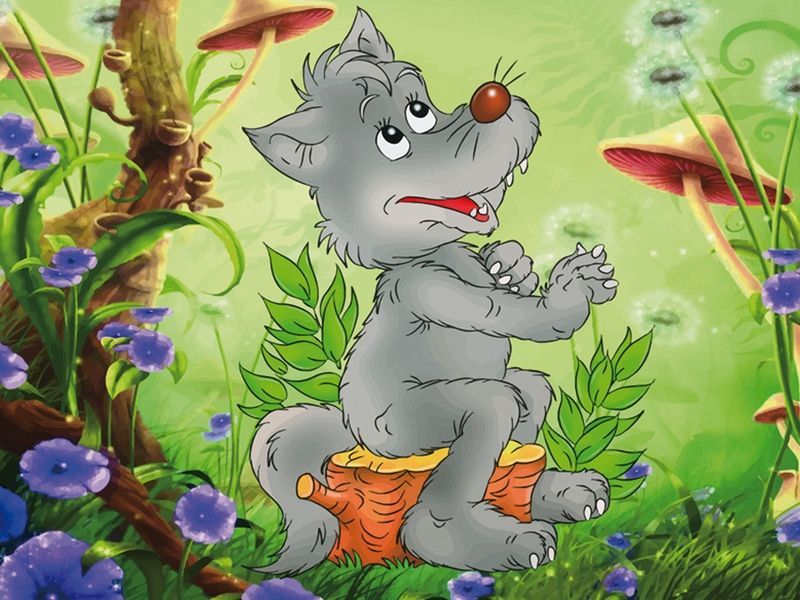 В наборе Волчонок на пеньке из мозаичных элементов можно выложить изображение волчонка, сидящего на пеньке. Яркие колокольчики и нежные одуванчики тоже необходимо выложить из мозаики, тогда как зеленый фон уже нанесен на холст.
