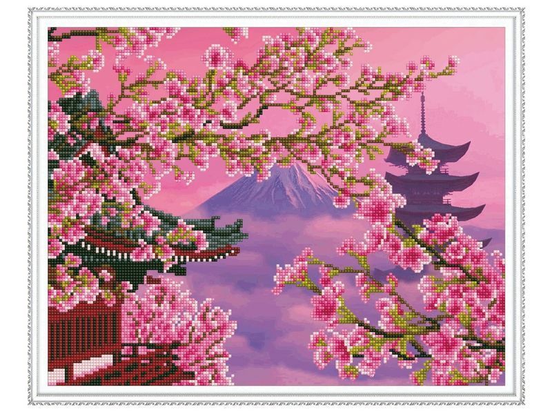 В наборе "Фудзияма" из мозаичных элементов можно выложить горы Фудзияма, расположенной на острове Хонсю. Основные оттенки, используемые при создании картины, розовые. На переднем плане - цветущая сакура, сквозь ветви которой где-то вдалеке возвышается гора Фудзияма.