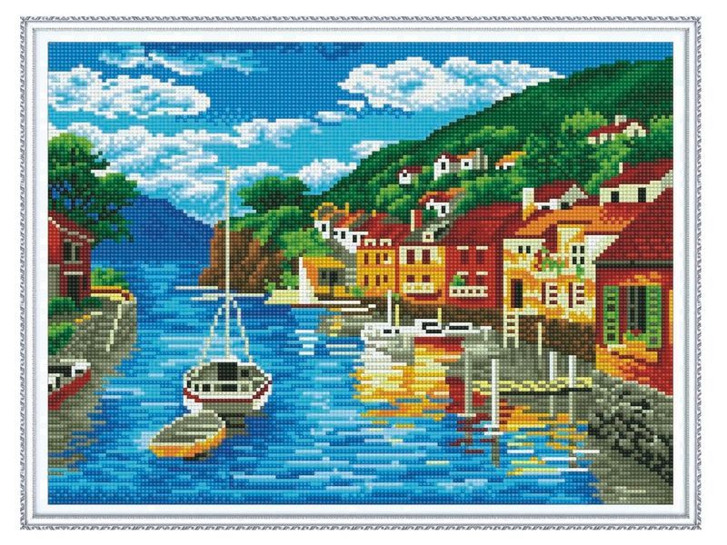 Алмазная мозаика с нанесенной рамкой 40х50 ГОРОДОК НА ЗАЛИВЕ (28 цветов)