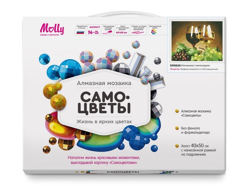 В наборе "Натюрморт с виноградом" из мозаичных элементов можно выложить натюрморт с бокалом белого и красного вина, и гроздью винограда.