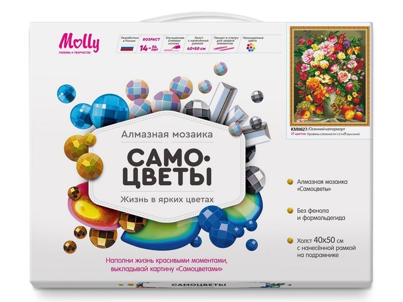 В наборе "Осенний натюрморт" из мозаичных элементов можно создать яркую, переливающуюся при свете картину с изображением яркого букета цветов.