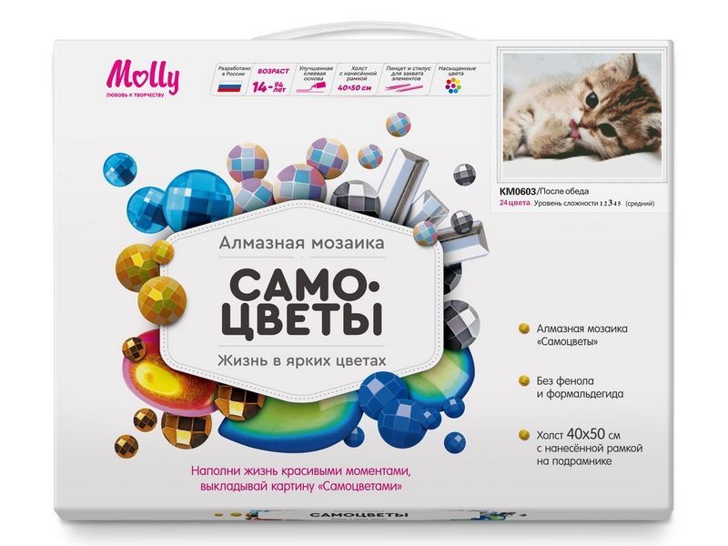 Алмазная мозаика - наборы, в которых желаемое изображение выкладывается на основе со схемой рисунка при помощи специальных декоративных элементов. Подсказка в виде нанесенного контура существенно облегчает задачу и дает возможность создавать картину даже людям, не имеющим художественных навыков. Готовая картина переливается на свету всеми цветами радуги.