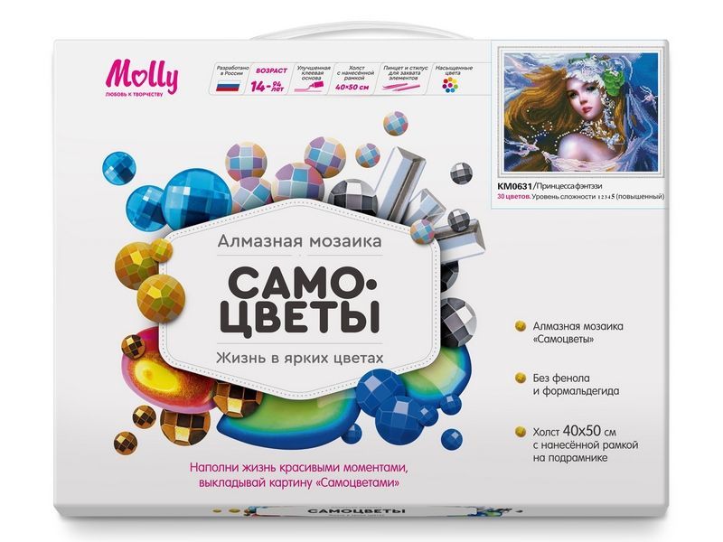 В наборе "Принцесса фэнтези" из мозаичных элементов можно выложить картину с принцессой в морских волнах, выполненную в стиле фэнтези.