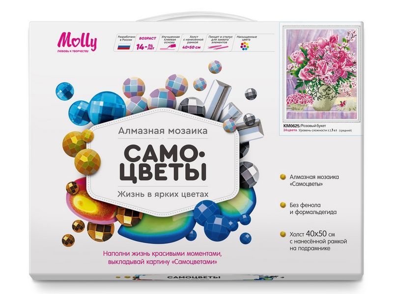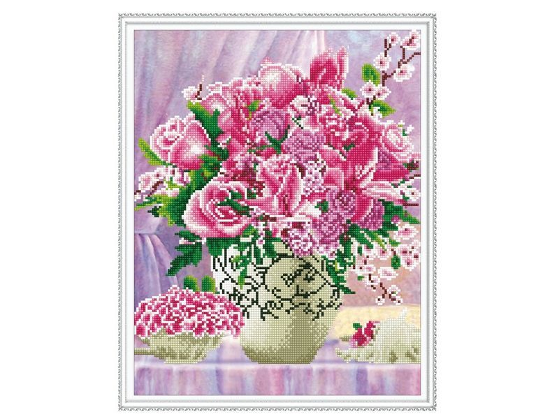 Алмазная мозаика с нанесенной рамкой 40х50 РОЗОВЫЙ БУКЕТ (24 цвета)