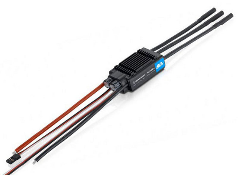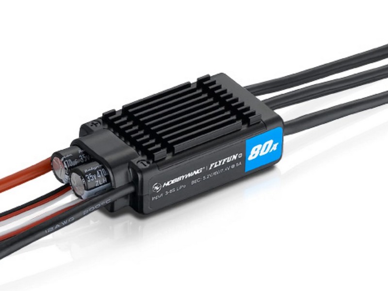Регулятор оборотов Hobbywing FlyFun 80А V5 3-8S (FLYFUN-80A-6S-V5) для радиоуправляемых авиамоделей с бесколлекторными моторами.