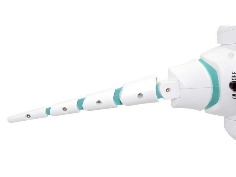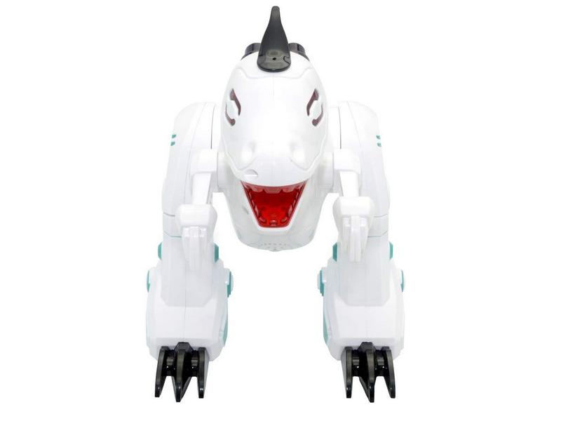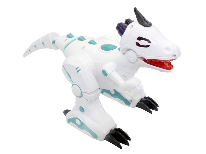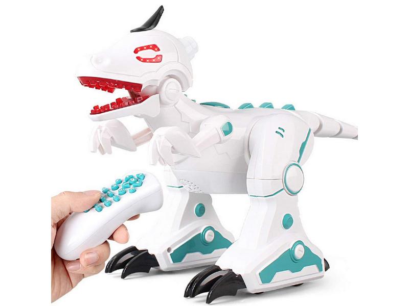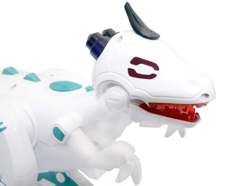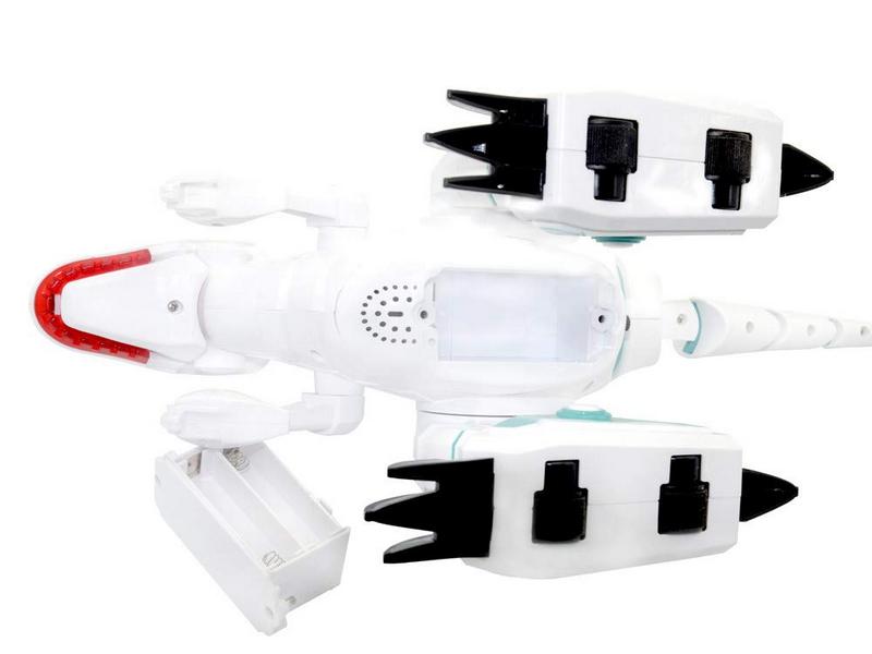 размер: 39 X 15 X 23 см вес: 400 г материал: ABS пластик пульт управления: 4 канала расстояние управления: 8 м время игры: около 1 часа цвет: белый, серый динозавр на ИК управлении пульт управления бутылочка для воды 4 батарейки типа АА для динозавра 2 батарейки типа АА для пульта управления