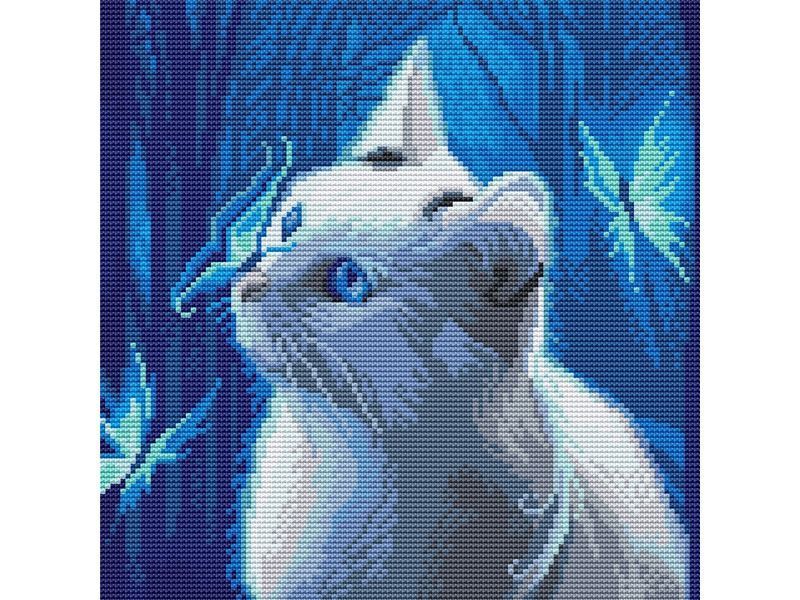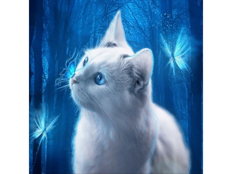 В наборе "Голубоглазая кошка" из мозаичных элементов на холсте можно выложить алмазную мозаику в стиле фэнтези. Белая кошка с голубыми глазами прогуливается по волшебному лесу, в котором летают светящиеся бабочки.