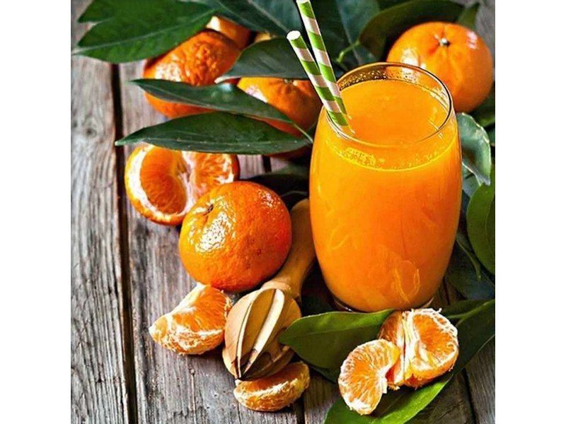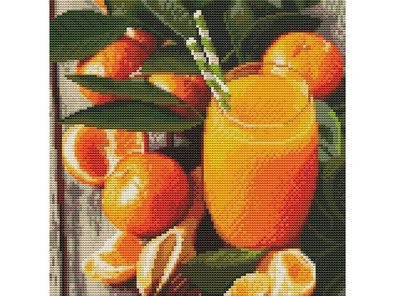 В наборе "Натюрморт с апельсинами" из мозаичных элементов на холсте можно выложить картину со стаканом апельсинового сока и сочными дольками мандарина.