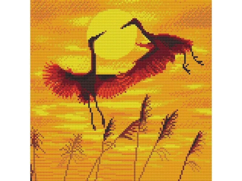 В наборе "Танец журавлей" из мозаичных элементов на холсте можно выложить картину с изображением двух танцующих журавлей на фоне огненного неба и яркого диска солнца.