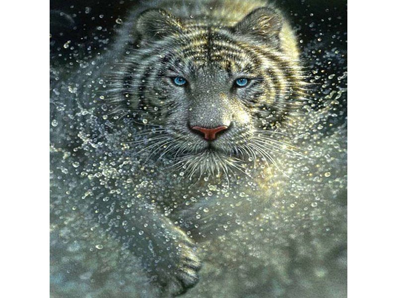 В наборе "Тигр" из мозаичных элементов на холсте можно выложить картину с изображением портрета тигра в брызгах воды.
