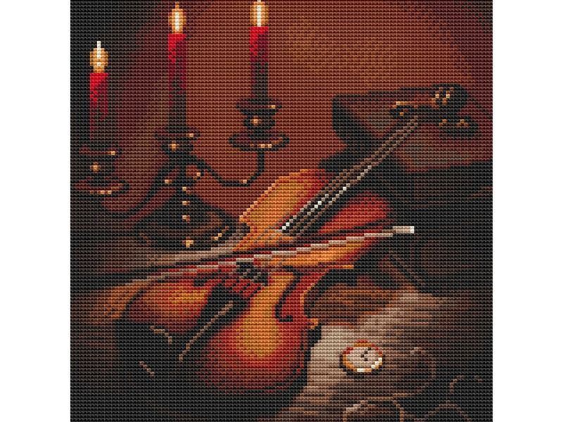 В наборе "Вечер музыки" из мозаичных элементов на холсте позволяет создать атмосферную картину музыкального вечера. Теплый свет свечи освещает комнату. На столе кем-то оставлены скрипка, смычок, часы, очки и ноты. Бронзовый подсвечник и лежащие в стороне старинные книги добавляют финальный штрих.