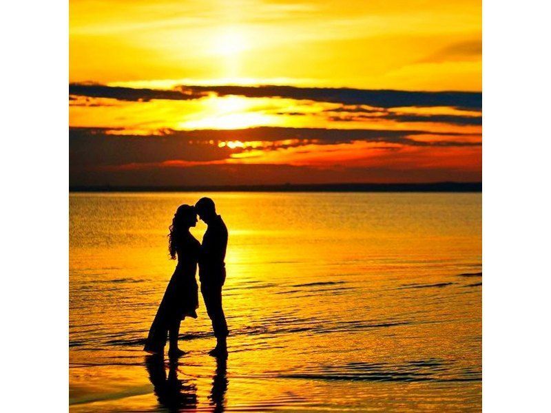 Закат для двоих - гимн влюбленным. На фоне потрясающего, закатного неба на берегу моря виднеются силуэты двух влюбленных. В картине используется ограниченное количество цветов, много оттенков.
