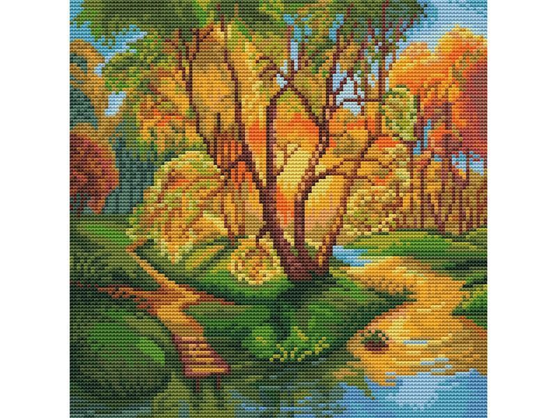 В наборе "Золотая осень" из мозаичных элементов на холсте можно выложить алмазную картину с осенним пейзажем. За счет большого количества цветов картина получается очень "живой" и реалистичной.