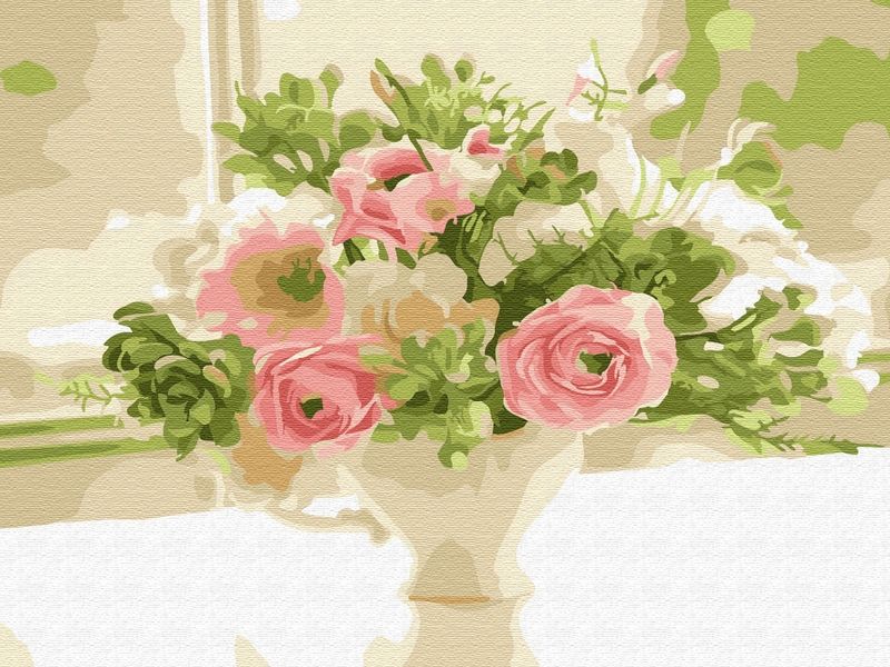Используя кисти и краски, на холсте можно нарисовать нежный, создающий торжественное настроение, букет невесты с розами. Для такого творчества не требуются специальные художественные навыки. Нужно лишь следовать инструкции и время от времени сверяться с цветовой схемой рисунка.