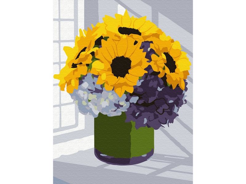 Картина по номерам 15х20 БУКЕТ ПОДСОЛНУХОВ С ГОРТЕНЗИЕЙ (13 цветов)