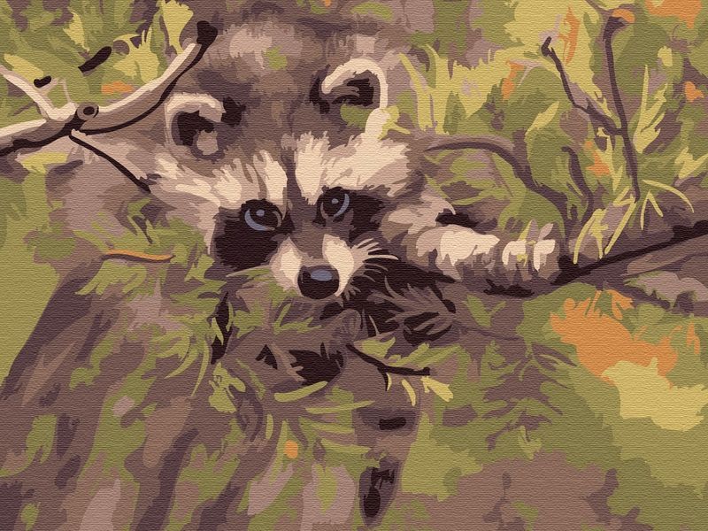 Используя кисти и краски, на холсте можно нарисовать енота, сидящего на еловой ветке. Для такого творчества не требуются специальные художественные навыки. Нужно лишь следовать инструкции и время от времени сверяться с цветовой схемой рисунка.