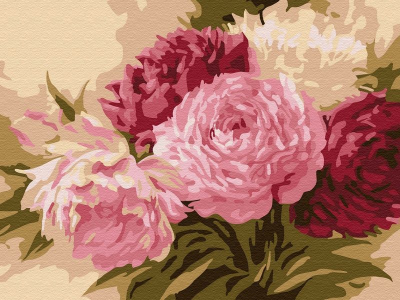 Используя кисти и краски, на холсте можно нарисовать яркий букет нежно-розовых пышных пионов. Для такого творчества не требуются специальные художественные навыки. Нужно лишь следовать инструкции и время от времени сверяться с цветовой схемой рисунка.
