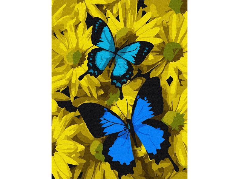 Используя кисти и краски, на холсте можно нарисовать двух ярких, синих бабочек в жёлтых цветах. Для такого творчества не требуются специальные художественные навыки. Нужно лишь следовать инструкции и время от времени сверяться с цветовой схемой рисунка.