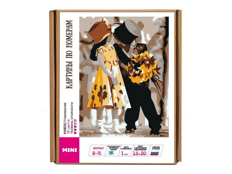 Используя кисти и краски, на холсте можно нарисовать картину "Ухаживание". На картине - юная парочка: леди в милом желтом платье и шляпке и джентльмен в смокинге с бабочкой. Для такого творчества не требуются специальные художественные навыки. Нужно лишь следовать инструкции и время от времени сверяться с цветовой схемой рисунка.
