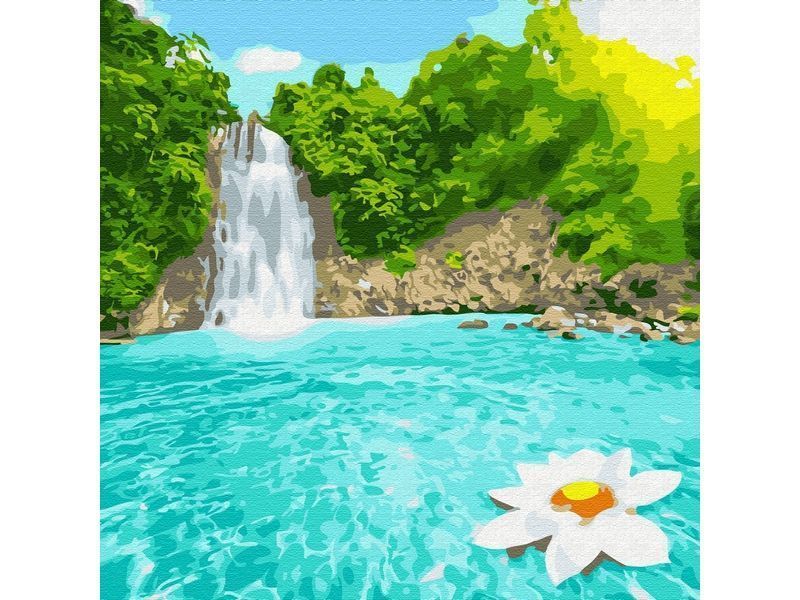 Используя кисти и краски, на холсте можно нарисовать картину с изображением лазурной, водной глади, гор и водопада. Для такого творчества не требуются специальные художественные навыки. Нужно лишь следовать инструкции и время от времени сверяться с цветовой схемой рисунка.