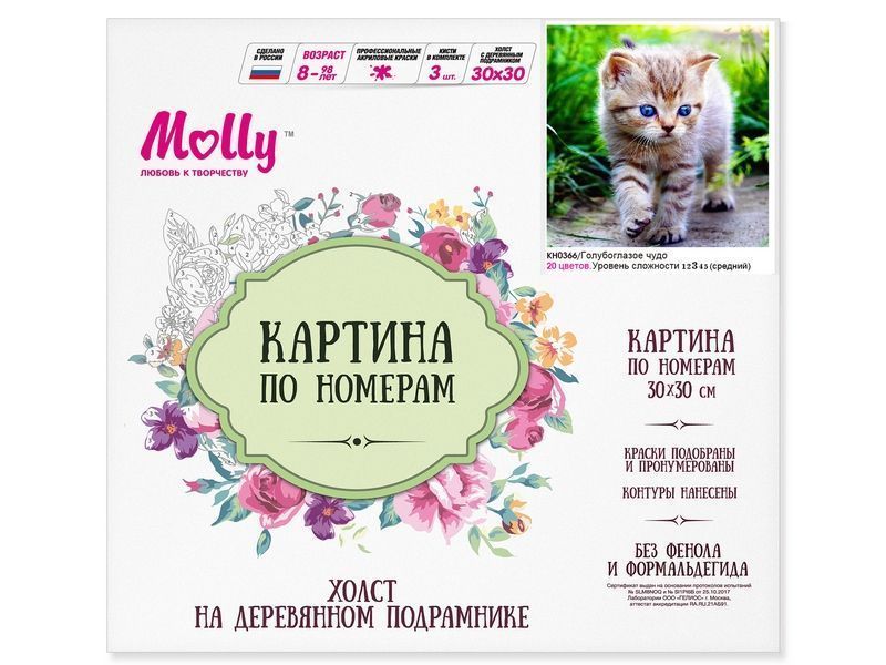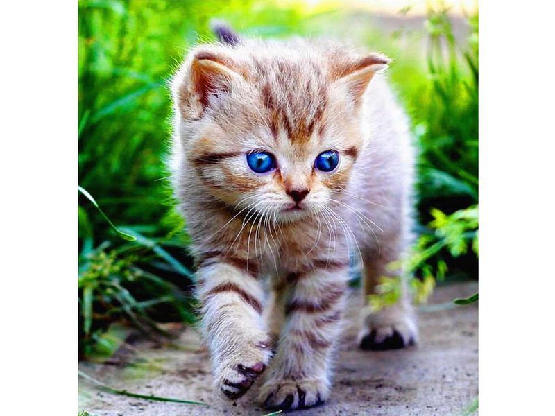 Используя кисти и краски, на холсте можно нарисовать картину "Голубоглазое чудо" - голубоглазого котенка, совершающего свои первые, неуверенные шаги во время самостоятельной прогулки.. Для такого творчества не требуются специальные художественные навыки. Нужно лишь следовать инструкции и время от времени сверяться с цветовой схемой рисунка.