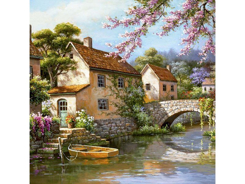 Используя кисти и краски, на холсте можно нарисовать пейзаж с видом на город, утопающий в цветах. Небольшой каменный мост через реку соединяет улицы между собой. Для такого творчества не требуются специальные художественные навыки. Нужно лишь следовать инструкции и время от времени сверяться с цветовой схемой рисунка.