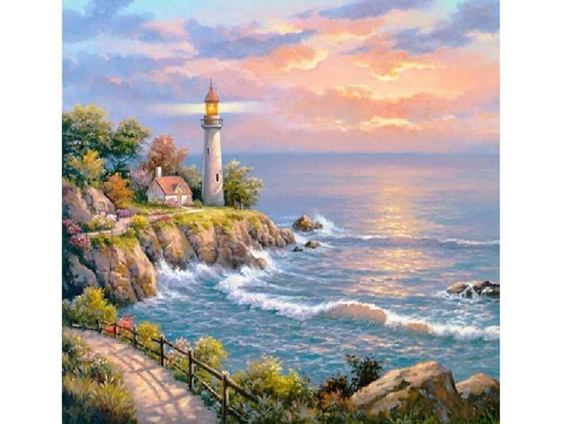 Используя кисти и краски, на холсте можно нарисовать маяк, стоящий на заливе, и домик рядом с ним. Небольшие волны одна за другой накатывают на берег. Для такого творчества не требуются специальные художественные навыки. Нужно лишь следовать инструкции и время от времени сверяться с цветовой схемой рисунка.