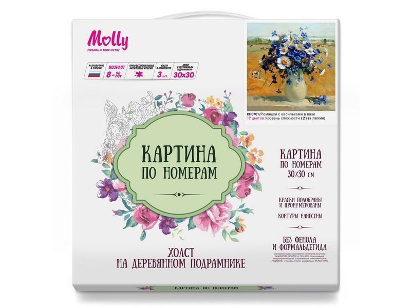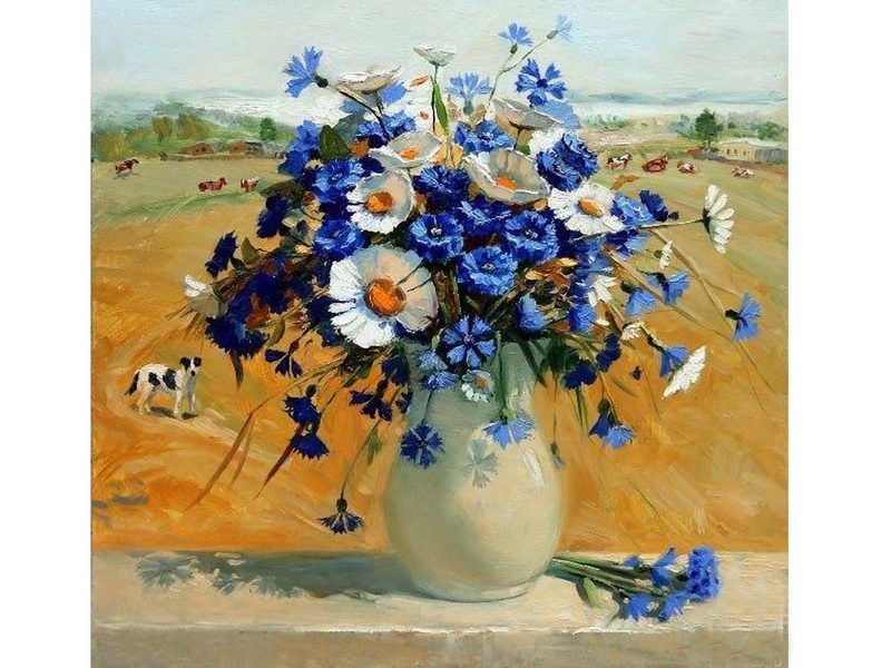 Используя кисти и краски, на холсте можно нарисовать нежный букет ромашек и васильков в вазе. Для такого творчества не требуются специальные художественные навыки. Нужно лишь следовать инструкции и время от времени сверяться с цветовой схемой рисунка.
