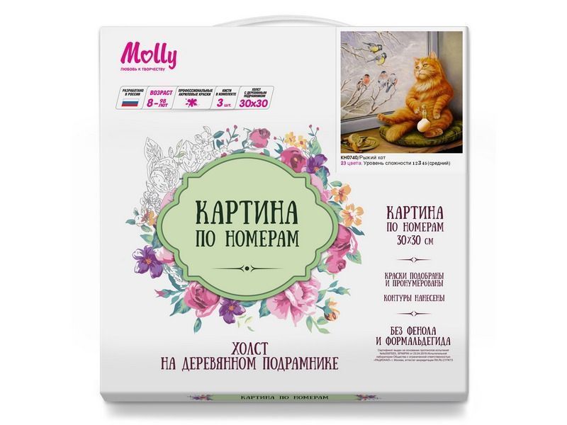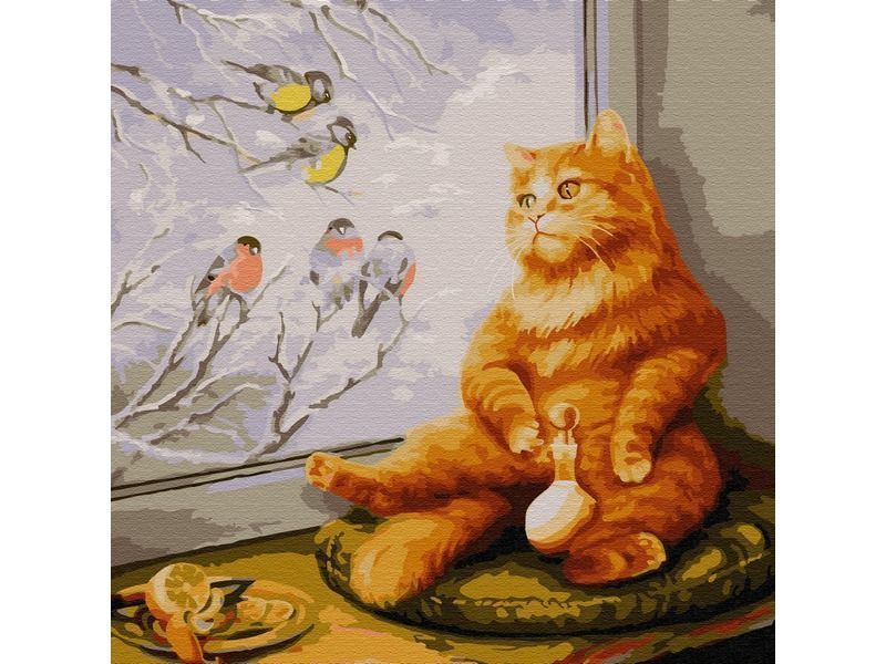 Используя кисти и краски, на холсте можно нарисовать рыжего кота, сидящего на подоконнике. Он задумчиво смотрит в окно на резвящихся на ветках птиц. Для такого творчества не требуются специальные художественные навыки. Нужно лишь следовать инструкции и время от времени сверяться с цветовой схемой рисунка.