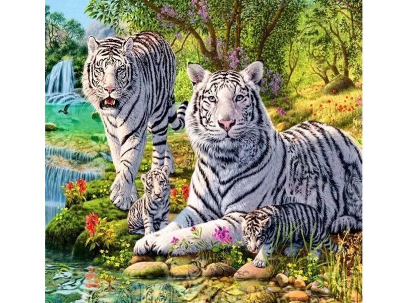 Используя кисти и краски, на холсте можно нарисовать картину "Семейство белых тигров" - семейство белых тигров, сидящих на живописном берегу. Для такого творчества не требуются специальные художественные навыки. Нужно лишь следовать инструкции и время от времени сверяться с цветовой схемой рисунка.
