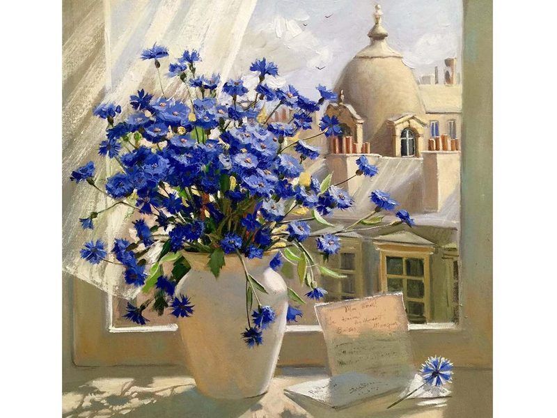 Используя кисти и краски, на холсте можно нарисовать картину "Вид из окна". На подоконнике стоит букет васильков в вазе. Окно открыто. Легкий ветерок колышет занавески. Возле вазы с цветами оставленное кем-то послание. Для такого творчества не требуются специальные художественные навыки. Нужно лишь следовать инструкции и время от времени сверяться с цветовой схемой рисунка.