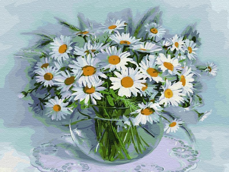 Используя кисти и краски, на холсте можно нарисовать картину Игоря Бузина "Ромашки" - букет нежных ромашек в вазе. В тон цветам на столе лежит нежная кружевная салфетка белого цвета. Для такого творчества не требуются специальные художественные навыки. Нужно лишь следовать инструкции и время от времени сверяться с цветовой схемой рисунка.