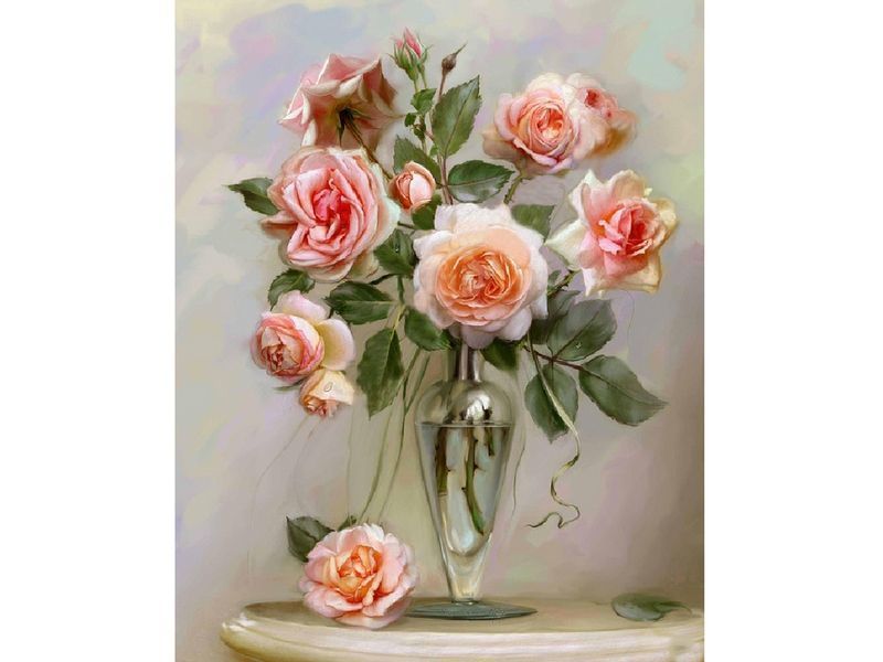Используя кисти и краски, на холсте можно нарисовать картину Игоря Бузина "Розы в вазе" - букет нежных роз в прозрачной вазе. Для такого творчества не требуются специальные художественные навыки. Нужно лишь следовать инструкции и время от времени сверяться с цветовой схемой рисунка.