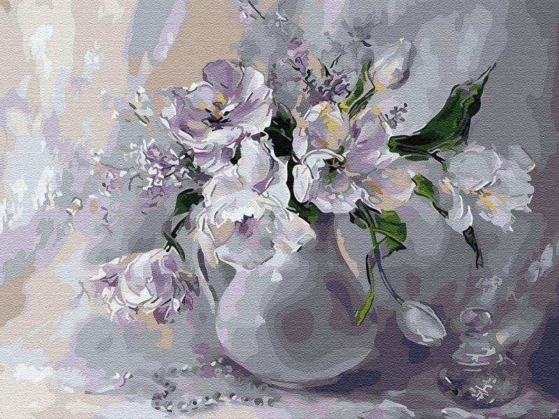 Используя кисти и краски, на холсте можно нарисовать нарисовать вазу с нежными тюльпанами. Рядом с вазой лежит нитка белоснежного жемчуга, стоит флакон духов. Для такого творчества не требуются специальные художественные навыки. Нужно лишь следовать инструкции и время от времени сверяться с цветовой схемой рисунка.
