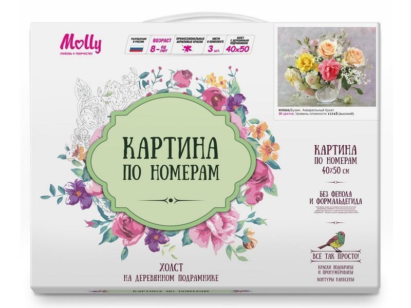 Используя кисти и краски, на холсте можно нарисовать картину Игоря Бузина "Акварельный букет" - нежный букет роз с эффектом прозрачности, воздушности, невесомости. Для такого творчества не требуются специальные художественные навыки. Нужно лишь следовать инструкции и время от времени сверяться с цветовой схемой рисунка.