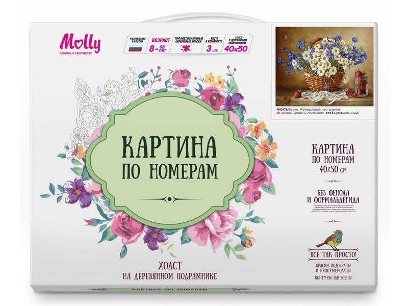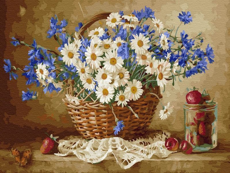 Используя кисти и краски, на холсте можно нарисовать картину Игоря Бузина "Ромашковое настроение" - букет васильков и ромашек в плетеной корзине. Белая, кружевная салфетка создает выигрышный акцент со спелыми ягодами вишни и клубники. Для такого творчества не требуются специальные художественные навыки. Нужно лишь следовать инструкции и время от времени сверяться с цветовой схемой рисунка.