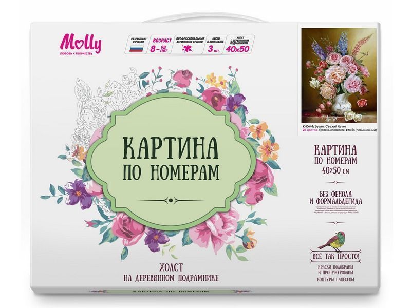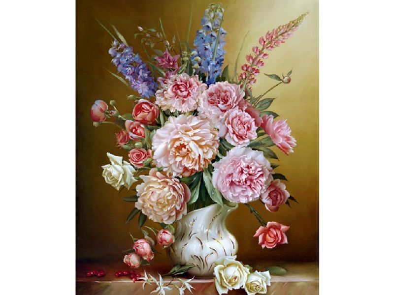 Используя кисти и краски, на холсте можно нарисовать картину Игоря Бузина "Свежий букет" - нежные пионы, голубые колокольчики, яркие розы и люпины. Для такого творчества не требуются специальные художественные навыки. Нужно лишь следовать инструкции и время от времени сверяться с цветовой схемой рисунка.