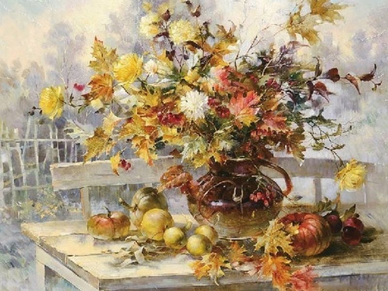 Используя кисти и краски, на холсте можно нарисовать картину Дачная осень. Фрукты, букет из листьев и осенних цветов на фоне дачного спокойствия. Для такого творчества не требуются специальные художественные навыки. Нужно лишь следовать инструкции и время от времени сверяться с цветовой схемой рисунка.