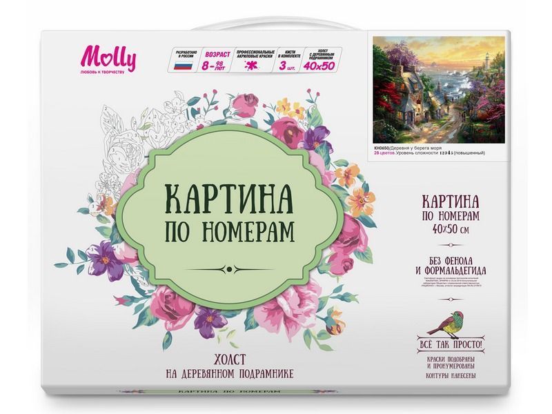 Используя кисти и краски, на холсте можно нарисовать деревню на берегу моря. Море неспокойно, на улочке местами виднеются лужи, прогуливаются люди. В домах, окруженных цветущими деревьями и кустарниками, уютно горит свет. Вдалеке виднеется маяк. Для такого творчества не требуются специальные художественные навыки. Нужно лишь следовать инструкции и время от времени сверяться с цветовой схемой рисунка.