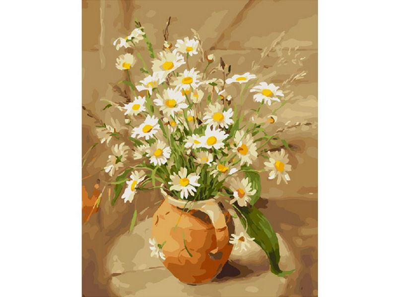 Используя кисти и краски, на холсте можно нарисовать букет очаровательных, нежных ромашек в вазе. Картина выполнена в приглушенных цветах, от этого она становится еще более привлекательной и приятной глазу. Для такого творчества не требуются специальные художественные навыки. Нужно лишь следовать инструкции и время от времени сверяться с цветовой схемой рисунка.
